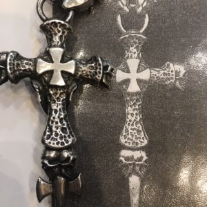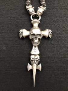 正式名称:Large Skull on 2Skull Hammer Cross with Double Skull Dagger& 2BullDogs Leather Braid Necklace